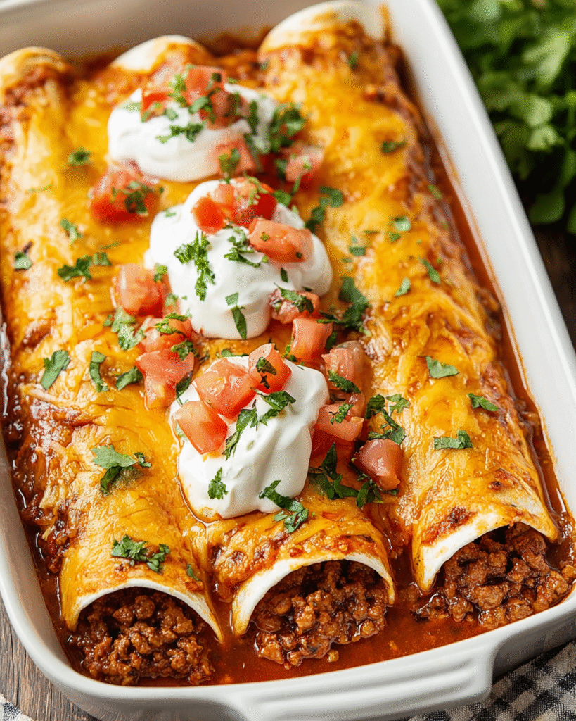 Fill each tortilla with shredded beef and a sprinkle of cheese. Roll them up tightly and place them seam-side down in the prepared baking dish.