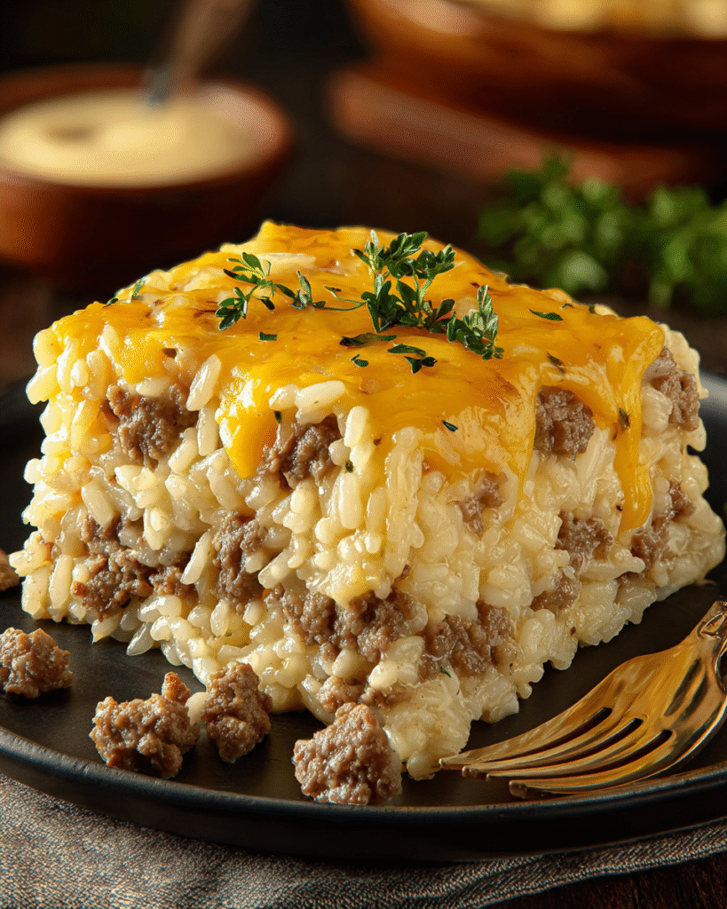 The magic of Cheesy Hamburger Rice Casserole lies in its simplicity. By combining everyday pantry staples, you get a dish that feels indulgent yet comforting. The ground beef adds heartiness, the rice makes it filling, the soup and sour cream bring creaminess, and the cheddar cheese ties everything together with a gooey, melty finish. It’s also extremely forgiving—perfect for both seasoned home cooks and beginners.