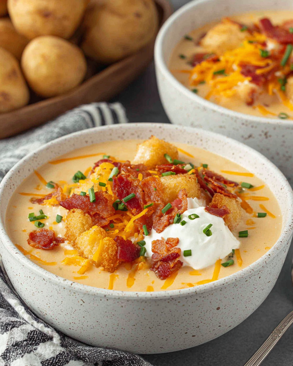 Ladle the hot soup into bowls and top with crumbled bacon, sliced green onions, and any additional cheese if desired. This finishing touch adds layers of texture and flavor, making each spoonful an enjoyable mix of creamy, crunchy, and savory.