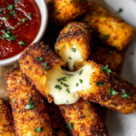 Transfer the hot, crispy mozzarella sticks to a serving platter and pair them with a small bowl of marinara sauce for dipping. This classic accompaniment not only adds flavor but also provides a refreshing balance to the rich, cheesy sticks. The warm sauce contrasts beautifully with the cool, tender cheese.