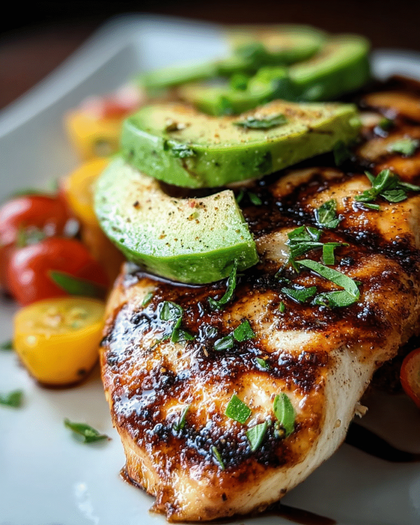 Here are some chef-approved tips to take your dish from good to great: Pound the chicken breasts slightly so they cook evenly and more quickly. Oil the grill grates or use a grill pan to prevent sticking. Use ripe but firm avocado to ensure it slices neatly and holds its shape. Let the chicken rest for 5 minutes after grilling to retain its juices. Slice the tomato just before serving so it stays fresh and doesn’t make the dish soggy. Make your own balsamic glaze by simmering balsamic vinegar with a bit of honey until thickened.