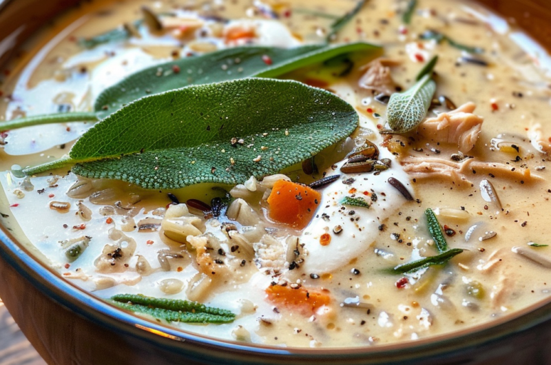 A rich, velvety broth loaded with nutty wild rice and tender chicken, finished with a crunchy, aromatic sage garnish.