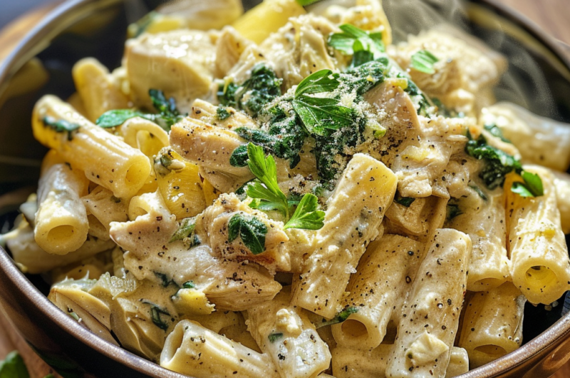 A vibrant, weeknight-friendly dinner where tender chicken, earthy artichokes, and fresh spinach simmer with spaghetti in a velvety, lemon-kissed cream sauce—no colander required.