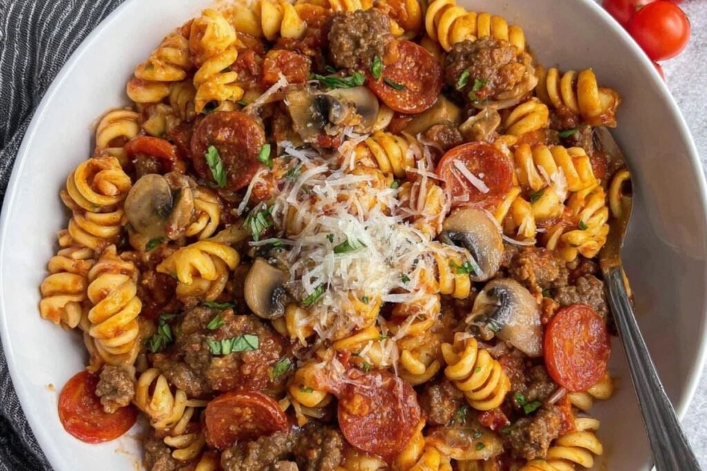 To make this delightful dish, you’ll need the following ingredients: 1 lb ground beef — You can also use ground turkey, chicken, or sausage if you prefer. 12 oz pasta — Penne or rotini work best because their shapes hold the sauce well. 1 can (24 oz) pizza sauce — Gives the dish its classic pizza flavor. 2 cups shredded mozzarella cheese — For that gooey, cheesy finish. 1/2 cup sliced turkey pepperoni — Adds a zesty, smoky touch. 1/2 cup chopped green bell pepper — Brings in a bit of crunch and color. 1/2 tsp garlic powder — Enhances the savory notes. 1/2 tsp Italian seasoning — Adds depth with herbs like oregano and basil. Salt & pepper — To taste. 3 cups water — Needed to cook the pasta directly in the pot.