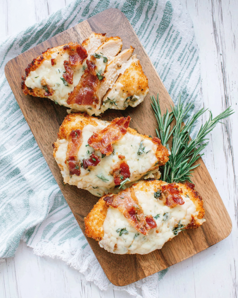 - Bake for 30–35 minutes, or until the chicken reaches 165°F internally and the topping is bubbly and golden.