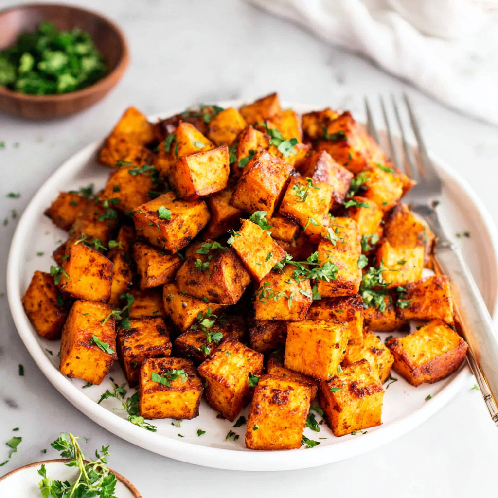 - If desired, garnish with chopped fresh parsley before serving. Enjoy your perfectly crispy sweet potato cubes!