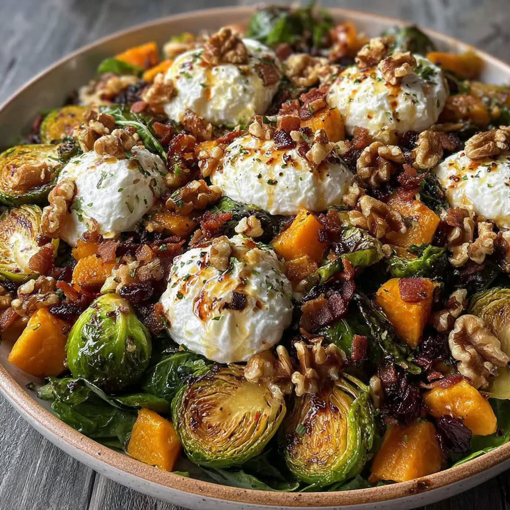- Assemble the salad with Brussels sprouts, butternut squash, burrata, bacon, walnuts, and feta.