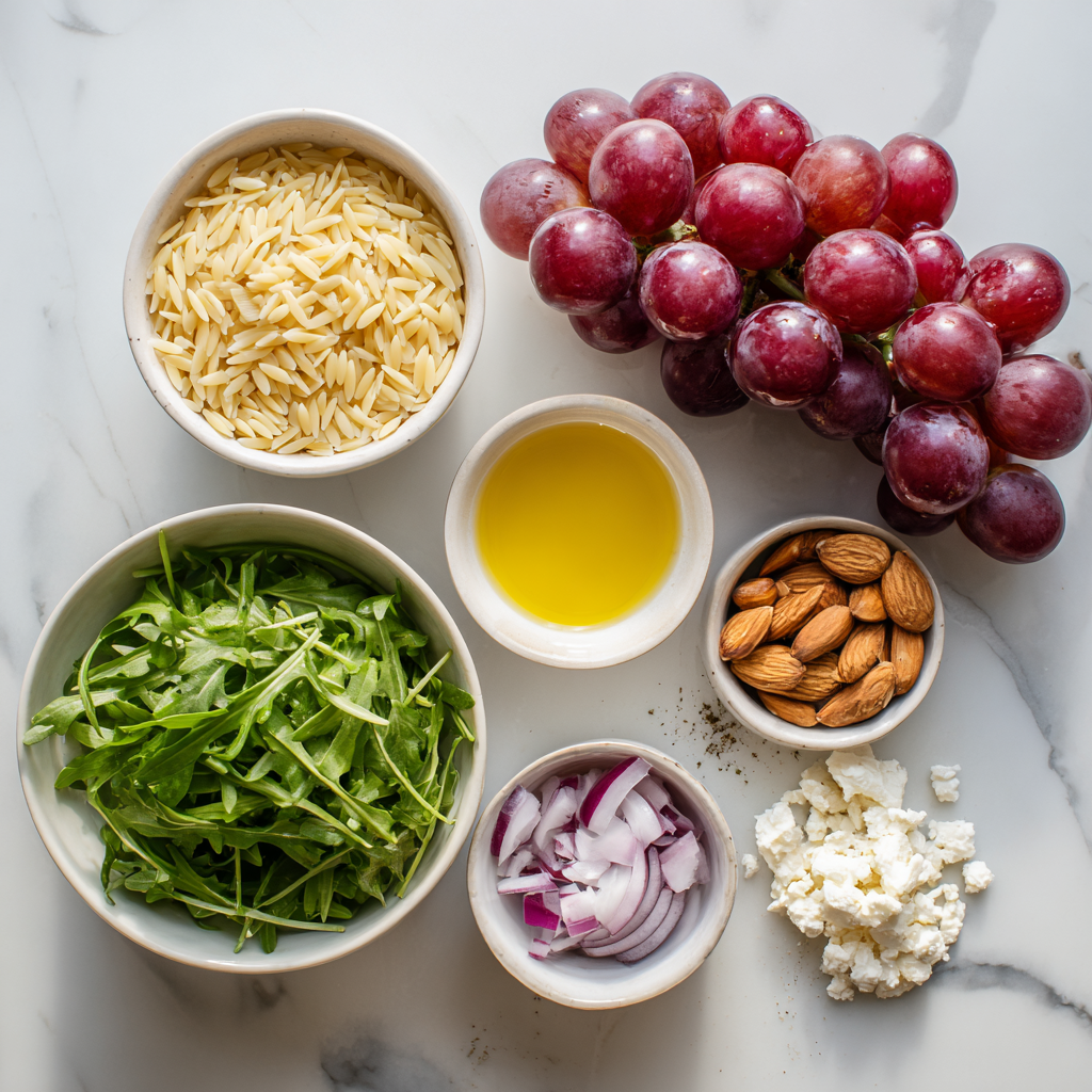 In a salad like this one, achieving a fine balance between sweet, salty, and tangy elements is crucial. The orzo provides a neutral base, allowing the flavors of the arugula and grapes to interplay beautifully. Feta adds saltiness, while the olive oil and lemon juice dressing ties everything together. Adjusting these elements according to personal taste can create a unique flavor profile that resonates with everyone.