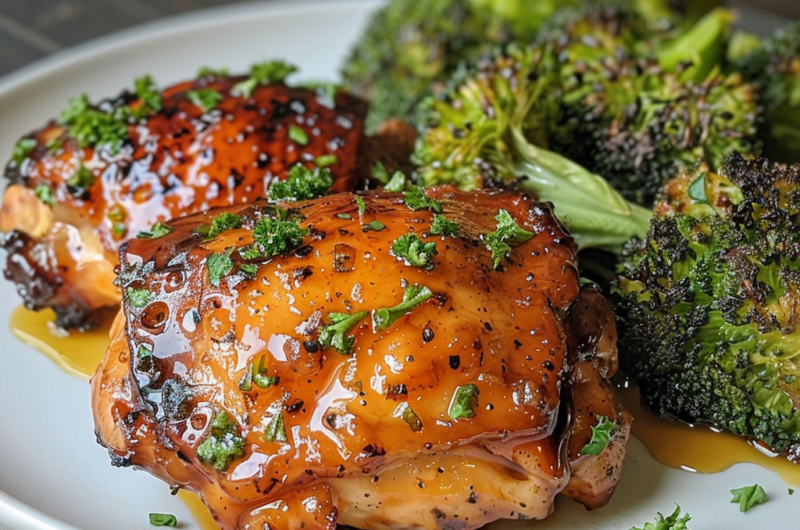 Golden, juicy chicken thighs with impossibly crispy skin, glazed in a sticky-sweet garlic sauce and roasted alongside charred broccoli—ready in 35 minutes.